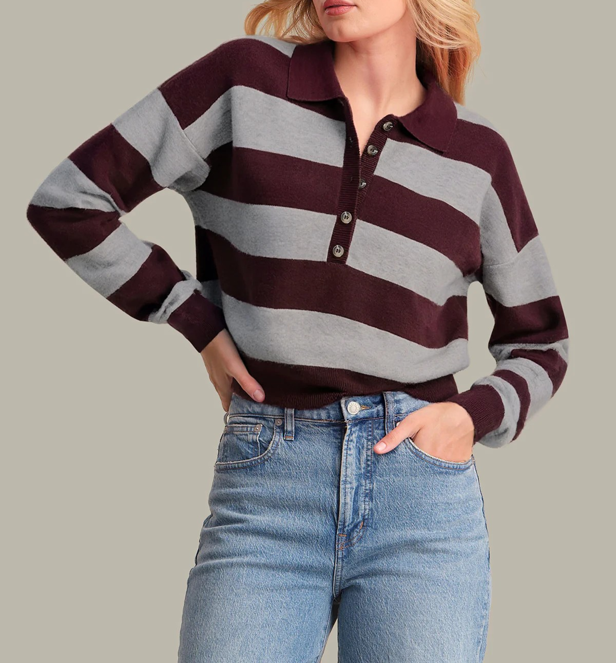 Add a touch of classic style to your wardrobe with the Rugby Stripe Sweater. Featuring a distinctive Johnny collar and a timeless striped pattern, this sweater offers a comfortable, slightly relaxed fit that layers effortlessly over shirts or tees. Perfect for both casual days and polished weekend looks; it combines everyday wearability with subtle sophistication.