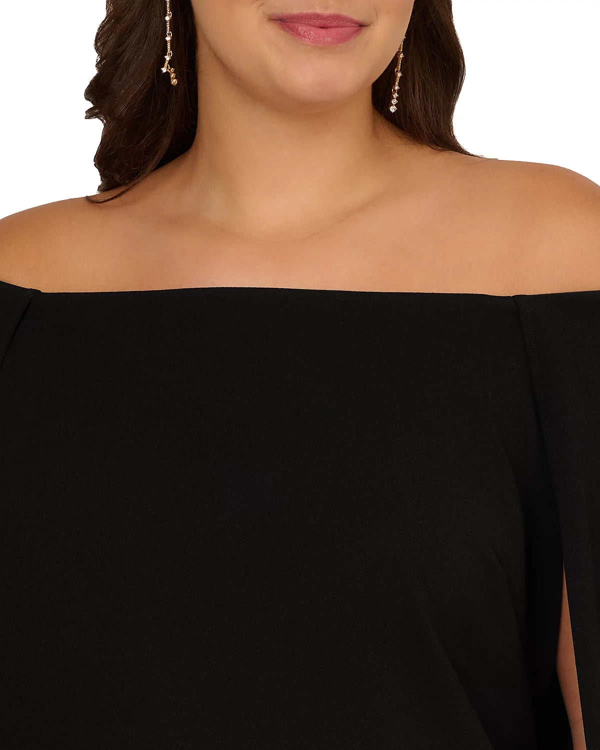 Off-the-shoulder neckCape sleevesZipper and hook-and-eye closures at backPolyester/elastane; Lining: PolyesterDry cleanImported
