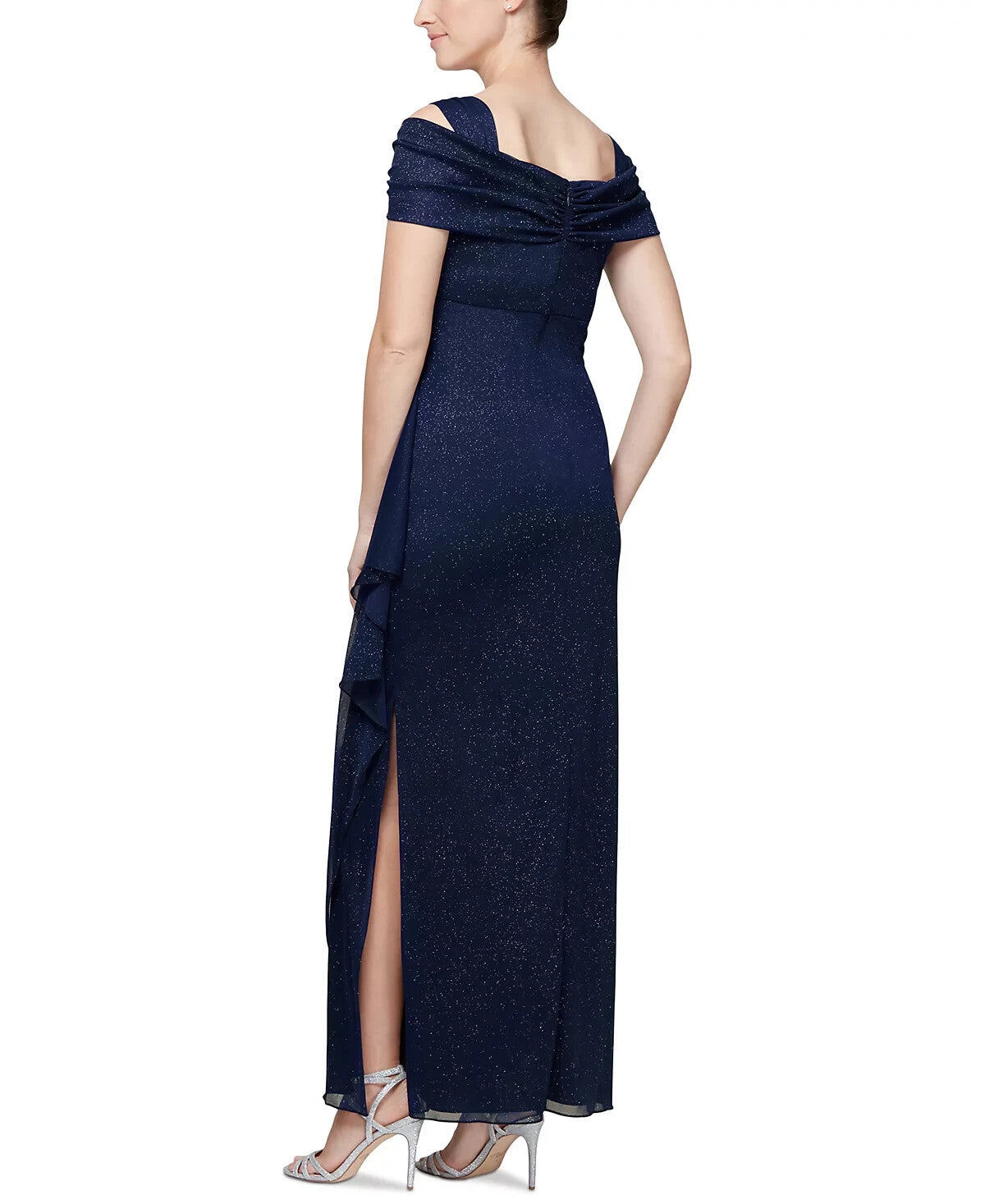 Make a shimmering style statement in Alex Evenings' petite gorgeous glittering column-silhouette gown. An elegantly draped and dreamy design is accented with a sophisticated cowlneck and cold-shoulder cutouts for an alluring hint of skin. Amp up the side-slit look with silver-toned strappy heels, a hand-held statement clutch and crystal chandelier earrings.