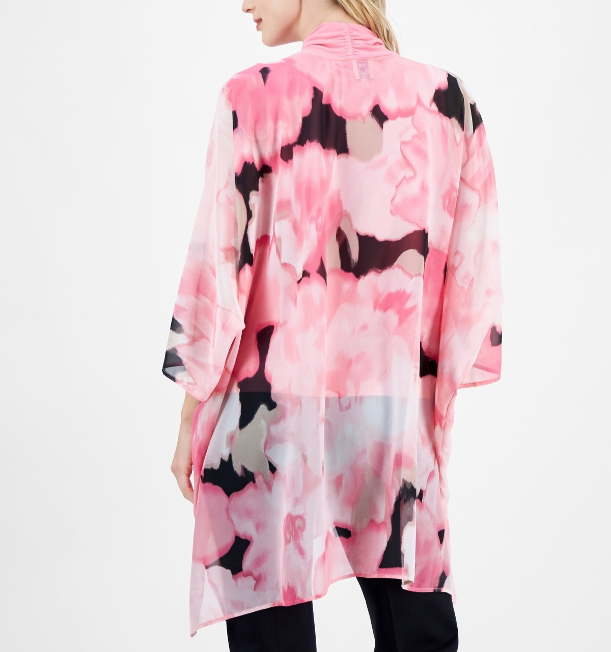 Top off your outfit with a light layer, this chic chiffon jacket from Anne Klein, a stylishly sheer design covered in charming  and finished with a versatile open front.
