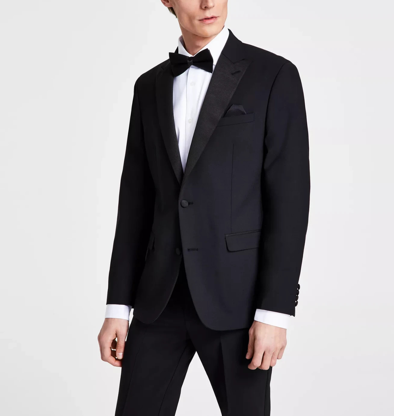 Bar III puts a subtle but sophisticated spin on a slim-fit tuxedo jacket with matching-color faille trim.