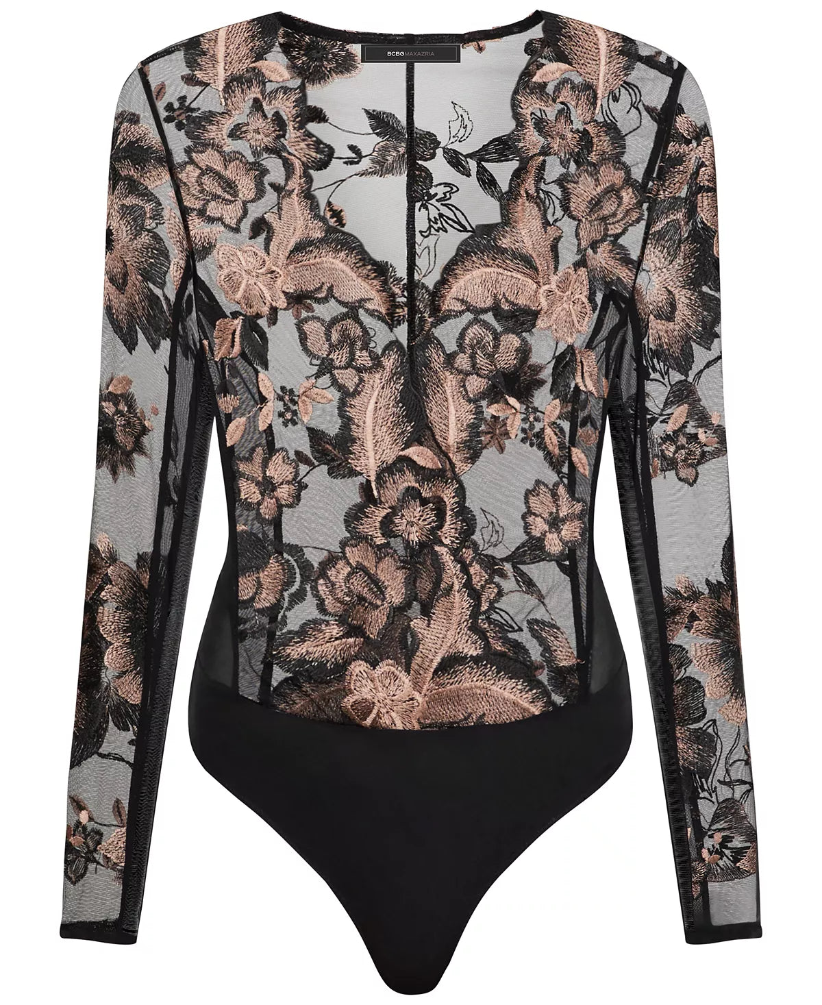 This bodysuit by BCBGMAXAZRIA is crafted from sheer mesh with strategically placed opaque panels of garden-inspired embroidery and a scalloped-edge plunging neckline.