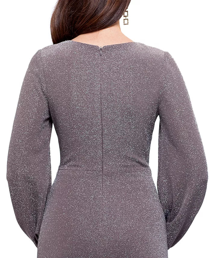 Plunging V-neck Long balloon sleeves Knotted front design Back zipper closure Gown silhouette Floor-length formal dress Nylon/metallic/spandex; lining: polyester Spot clean Made in USA