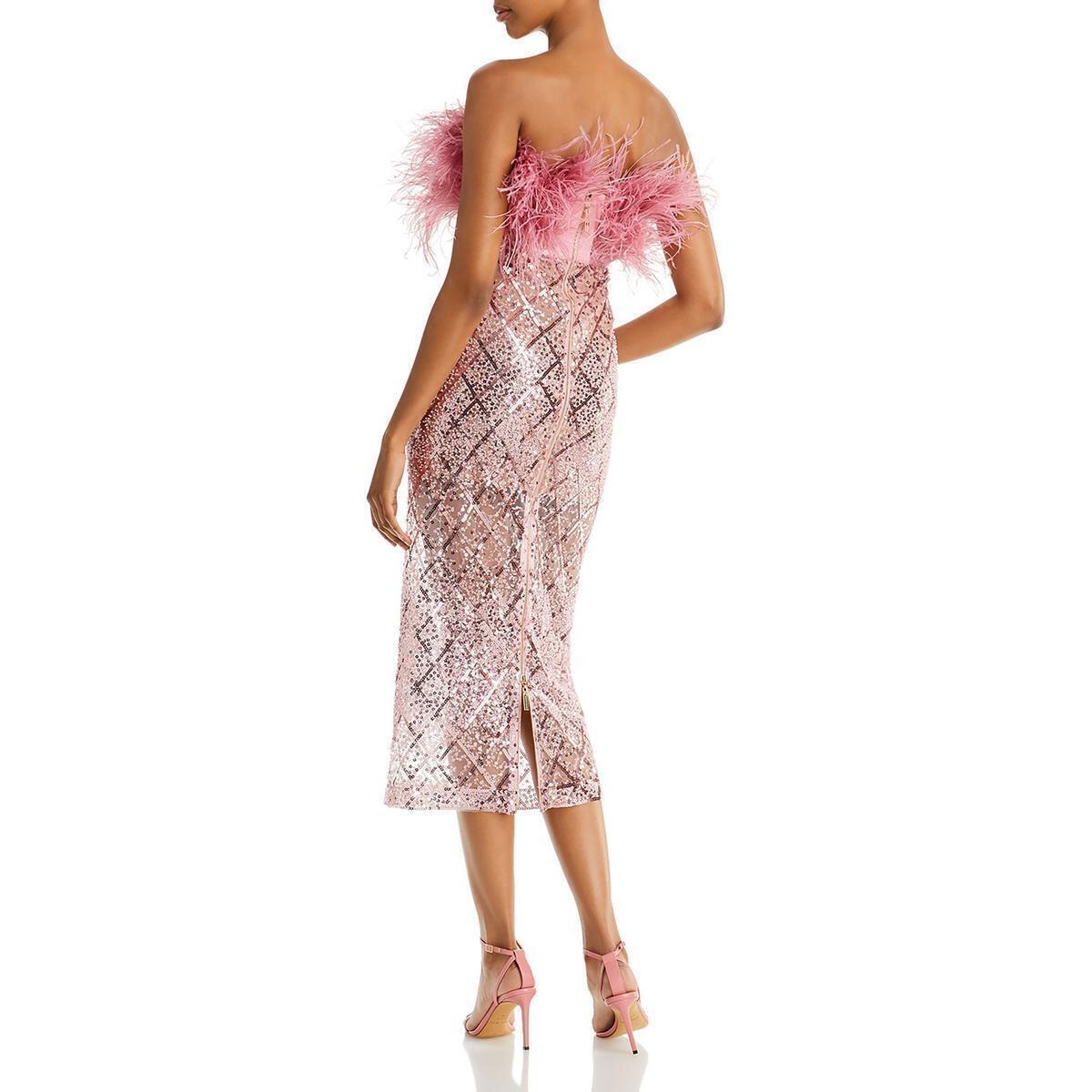 Body-skimming fit at the bust, waist and hip Non-stretch fabric Designed to hit at mid calf Straight neck Strapless Feather-embellished bust Empire waist Allover diamond pattern sequin embellishment Exposed two-way zip closure Lined to mid-thigh Self: 100% polyester; trim: 100% Ostrich feathers; lining: 95% polyester/5% elastane Dry clean Imported