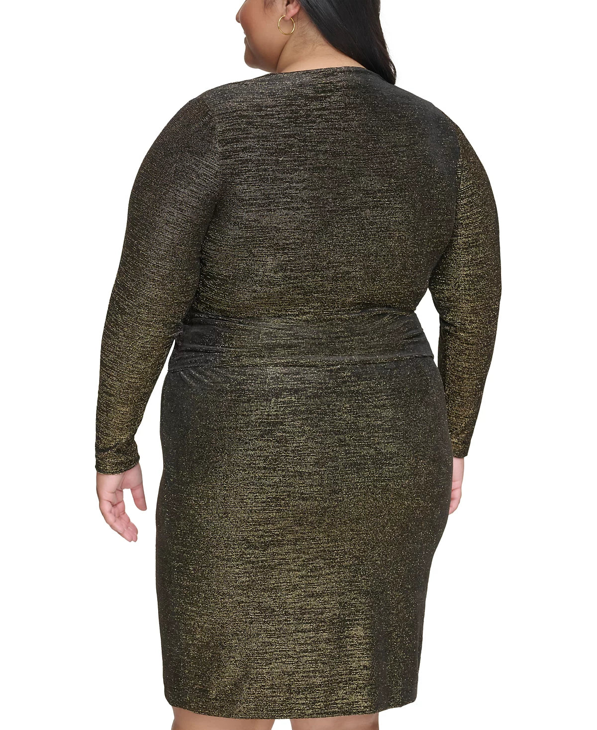 The shimmery hug of this Calvin Klein plus size V-neck sheath is finished with a stylish twist at the side.
