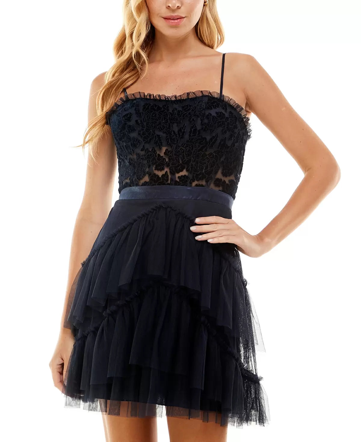 Sweetheart neckline Sleeveless Adjustable spaghetti straps Banded waist; tiered skirt Back zipper closure Fit & flare silhouette Fitted through the chest and waist; flared and flowing skirt Shell and lining: polyester Dry clean Imported