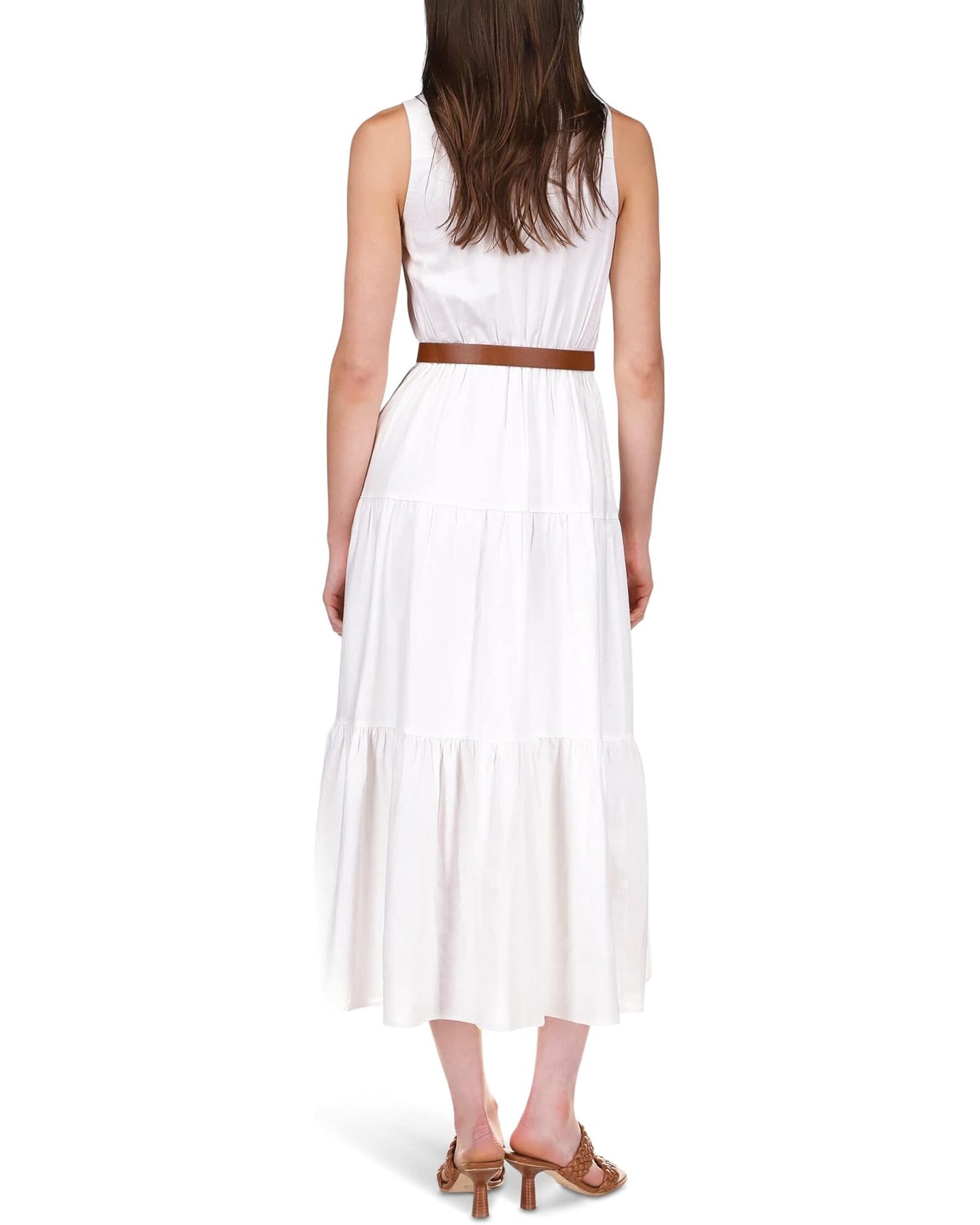 Relaxed through bust, waist and hips, cinched at waist with belt Non-stretch fabric Designed to hit at mid calf Point collar Sleeveless Center front button closures Two on-seam pockets at hips; two chest flap pockets with button closure Detachable boyfriend belt at waist Tiered skirt Linen/Viscose; Lining: Cotton Dry clean Imported