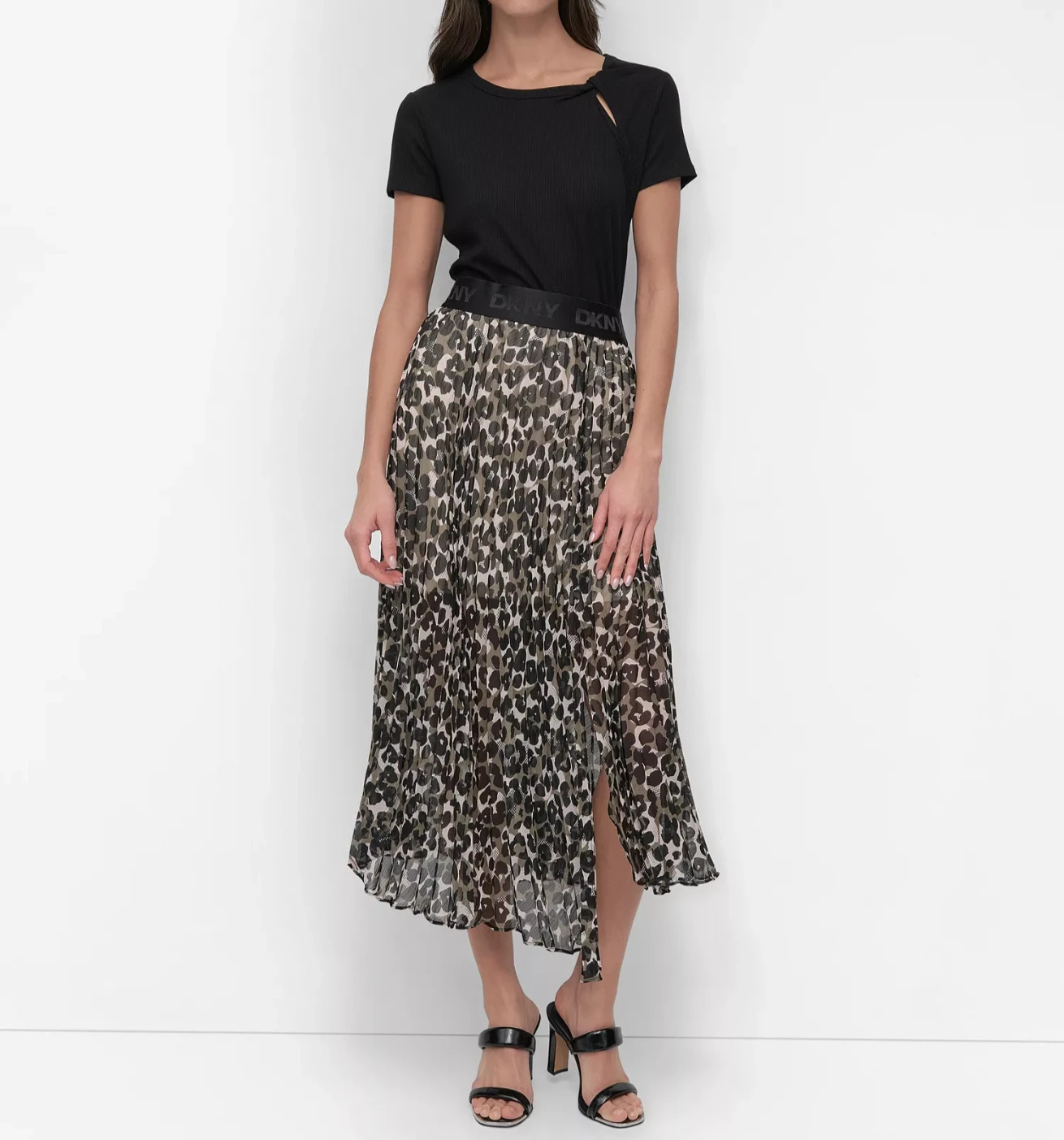 Take a walk on the wild side in this bold, animal-print midi skirt from DKNY.