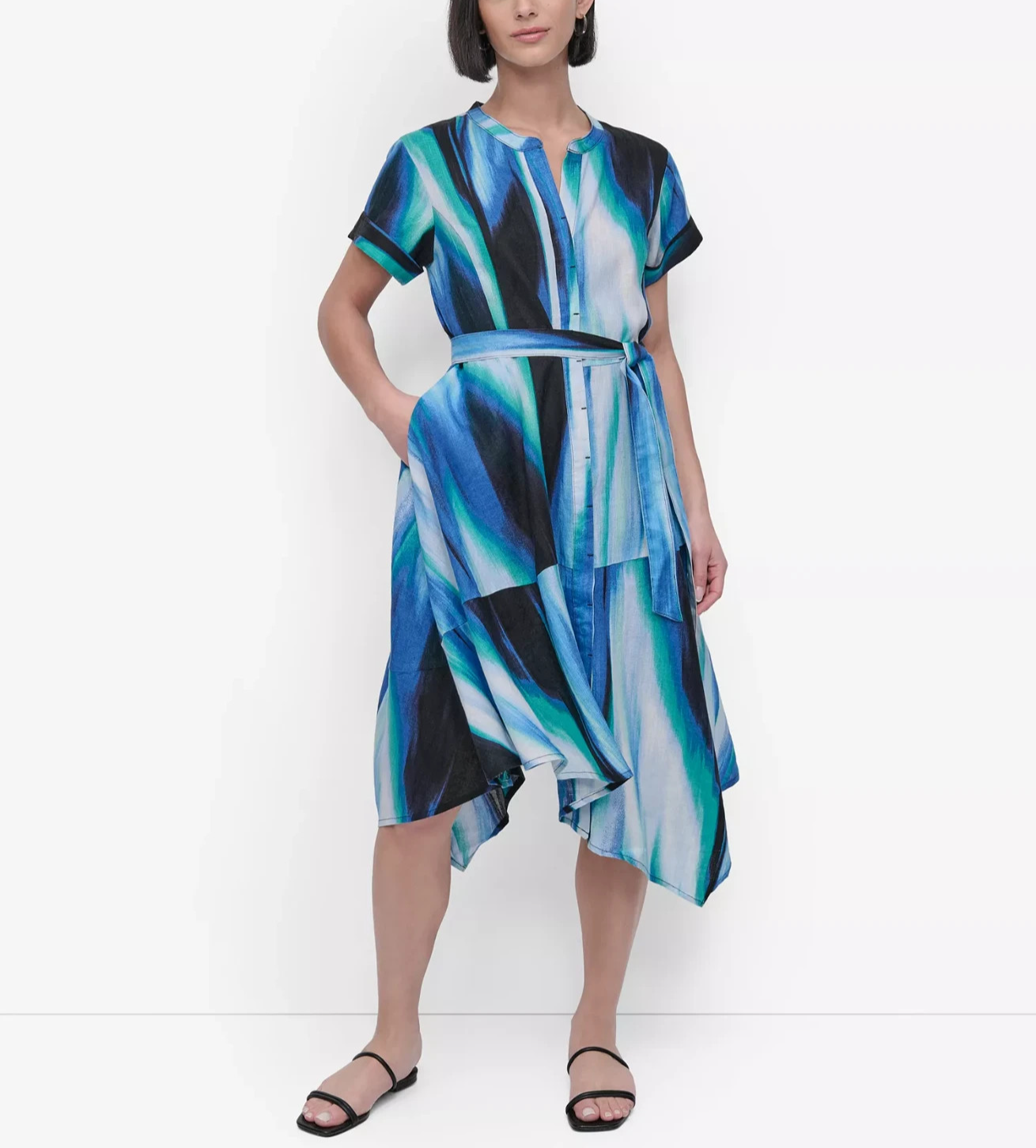 A tie at the waist lends an instantly cinched finish to this short sleeve linen dress from DKNY. Fashioned with an asymmetric high-low hem and button front closures, this polished midi dress is the perfect addition to any collection.