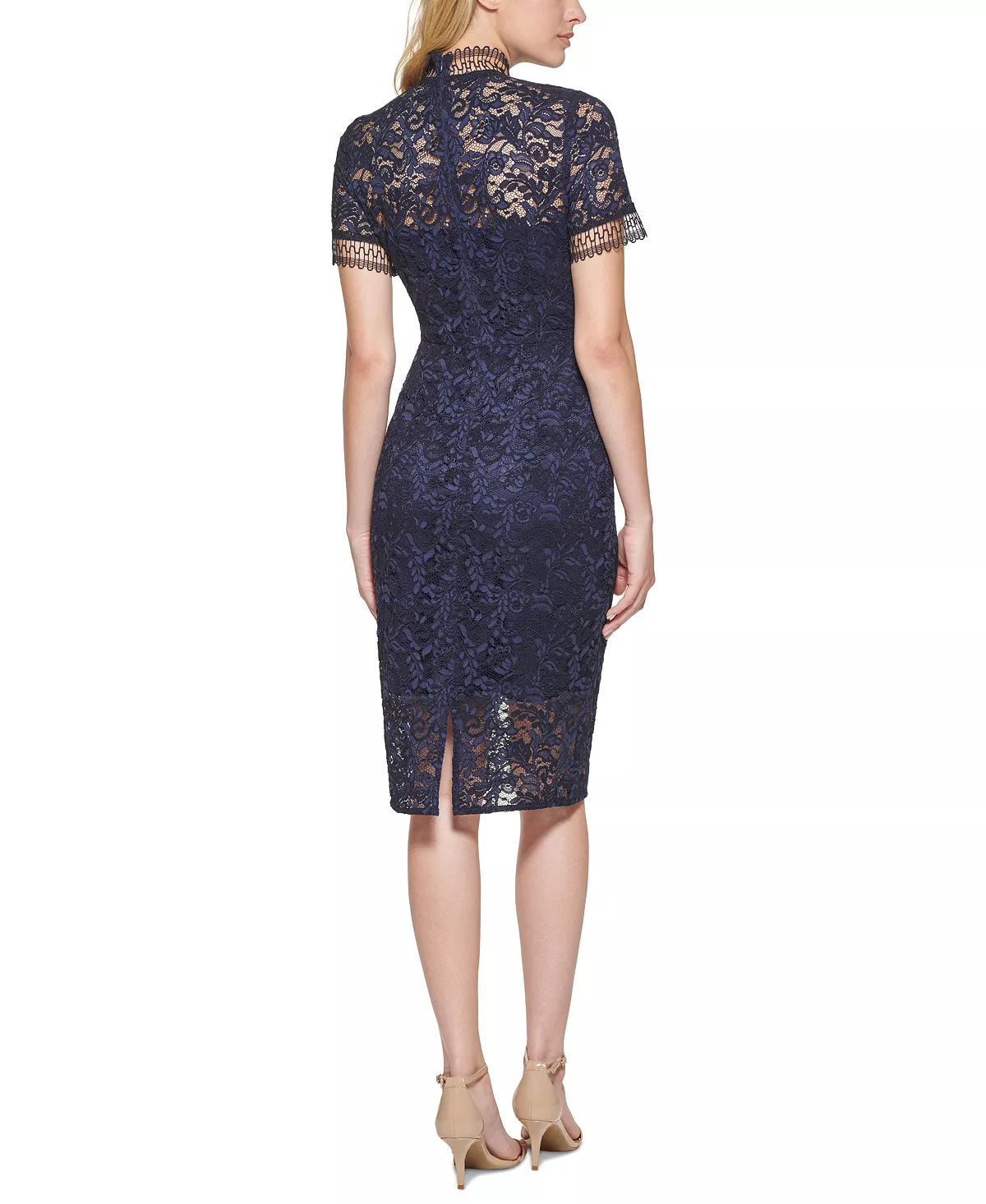 Tailored fit through bust, waist and hips Non-stretch fabric Designed to hit at the knees Mock neck Straight illusion neckline Short sleeves Contrast-lace stand collar and cuffs Semi-sheer yokes and sleeves Strapless-bra-friendly Illusion hem, back vent Sheath silhouette Allover mixed-lace overlay Concealed back zip with hook-and-eye closure Rayon/nylon/cotton; lining: Polyester Dry clean Imported