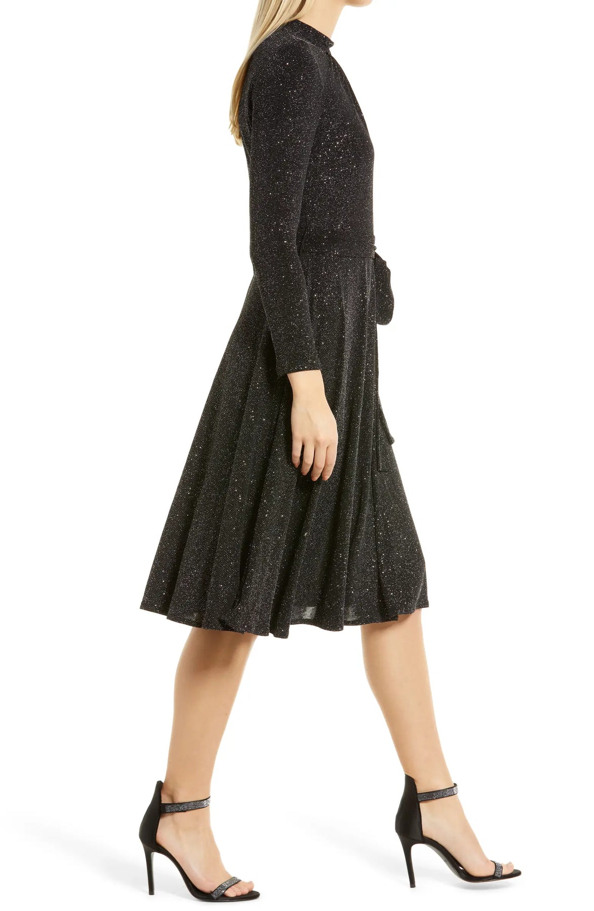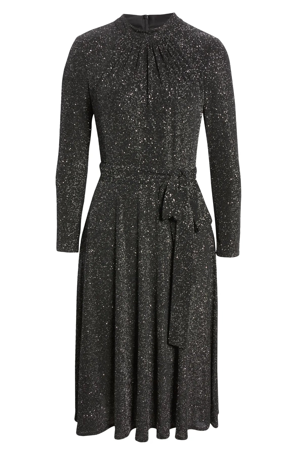 A dusting of metallic sparkles bring subtle glamour to a long-sleeve dress in a classic fit-and-flare silhouette with gentle pleats at the neck.