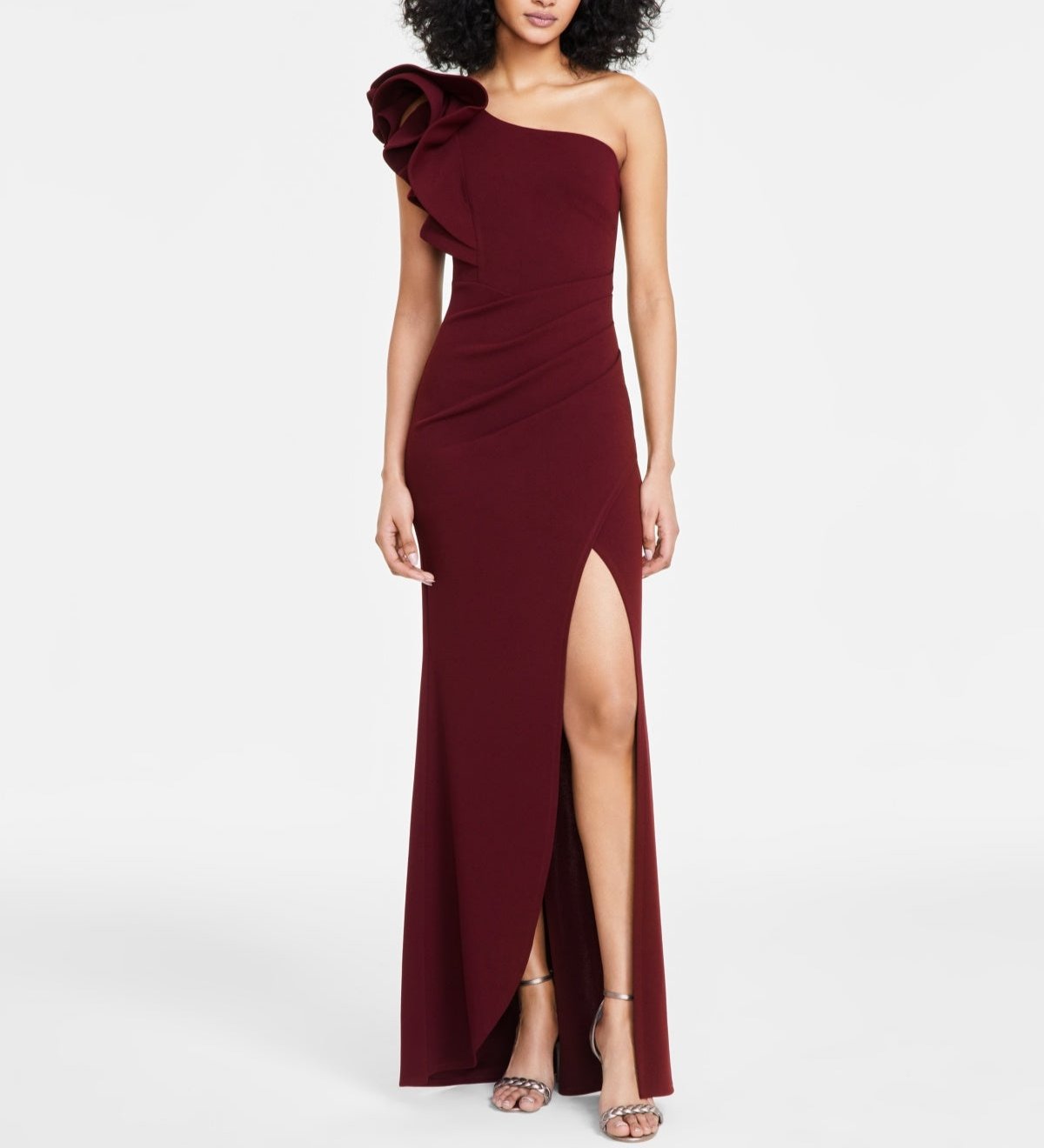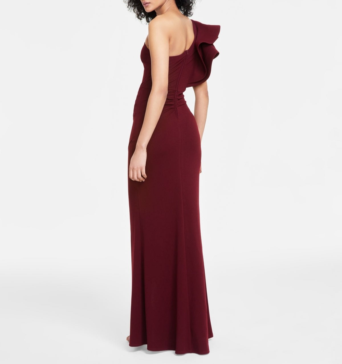 Looking for a stunning, main event style? Look no further than this elegant and iconic mermaid gown by Emerald Sundae, defined by a dramatic ruffle at the shoulder for a head-turning look.
