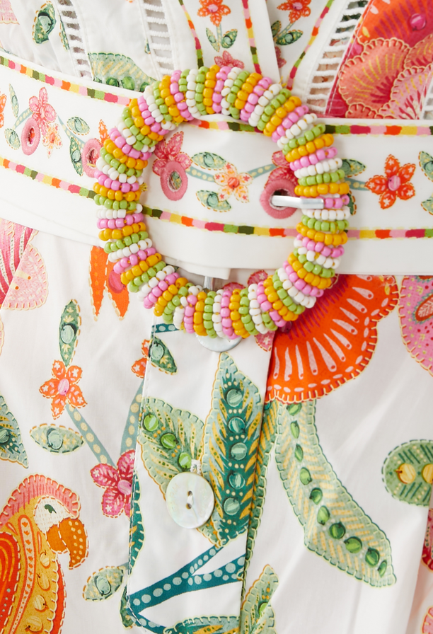 Pastel parrots and pretty blooms cheerfully pattern an cotton romper, dipped at the neckline and cinched with a matched belt. A pair of handy pockets perfects the look.