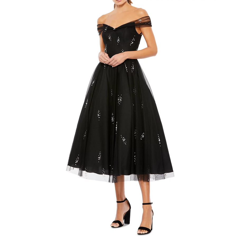 Off-the-shoulder neckBack zipper closureOff-the-shoulder sleevesBeaded embellishmentsNon-stretch fabricDesigned for a midi length100% polyesterSpot cleanImported
