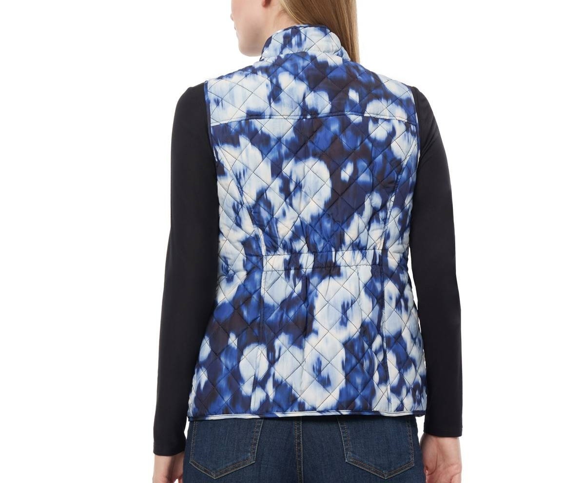 Mock neck Zipper closure with snap placket at front Allover print Patch flap pockets at front Sleeveless Shell, lining and fill: Polyester Dry clean Imported