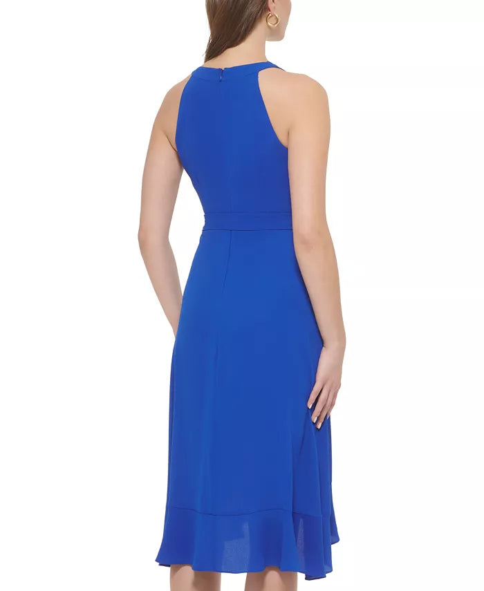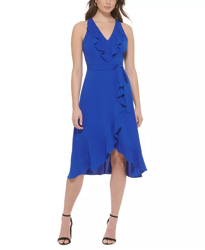 Ruffle trim at neckline; self tie at waist; ruffled crossover high-low hem