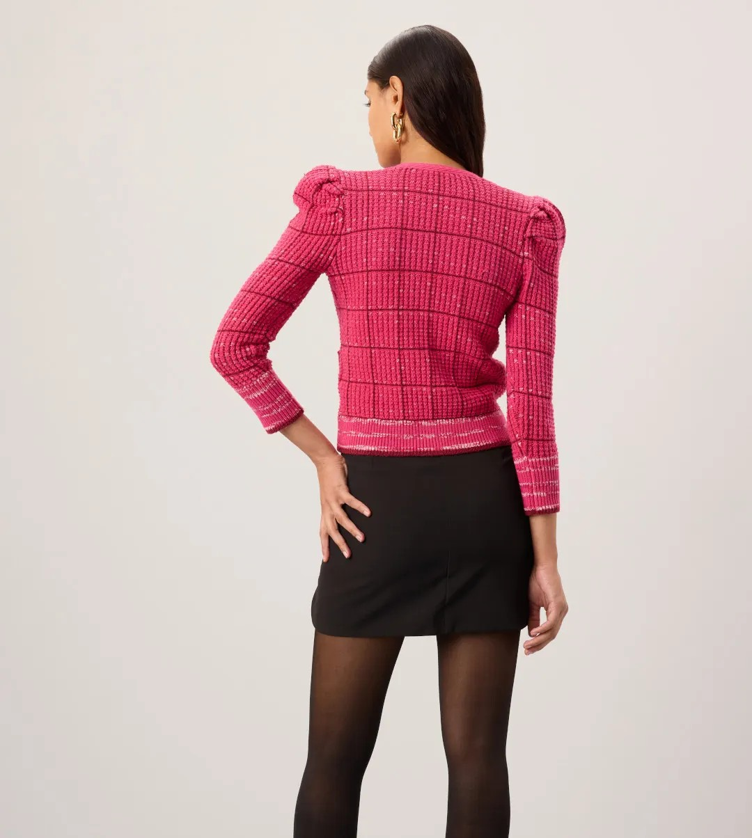 This vibrant pink tweed jacket from L'agence features structured shoulders and a fitted silhouette, offering a sophisticated yet playful look. Pair it with a sleek black skirt and heels for a polished ensemble.
