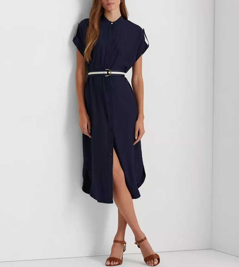 Lauren Ralph Lauren's lightweight crepe shirtdress is punctuated with a striped self-belt for a nautical-inspired finish.