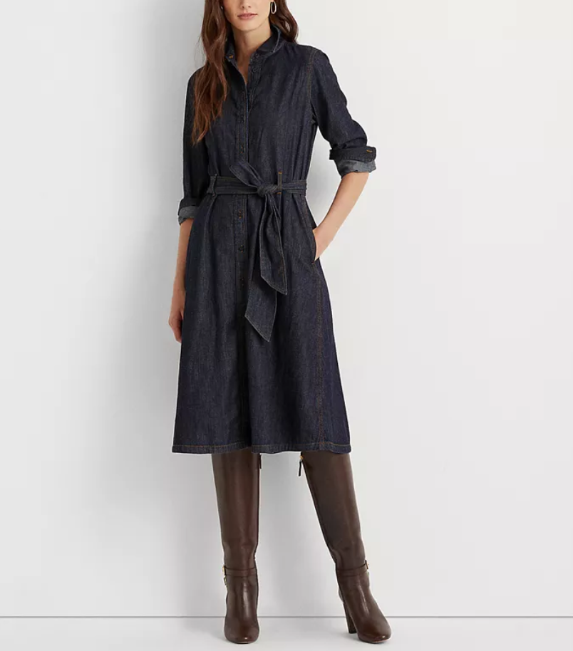 Lauren Ralph Lauren's right-hand-twill denim shirtdress is cut for an A-line silhouette and finished with a waist-cinching self-belt.