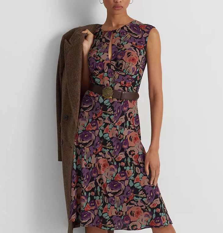 Defined by its timeless empire silhouette, a self-belt, and the season's vibrant floral motif, Lauren Ralph Lauren's knee-grazing dress is artfully crafted from airy crepe for a fluid drape and graceful movement.