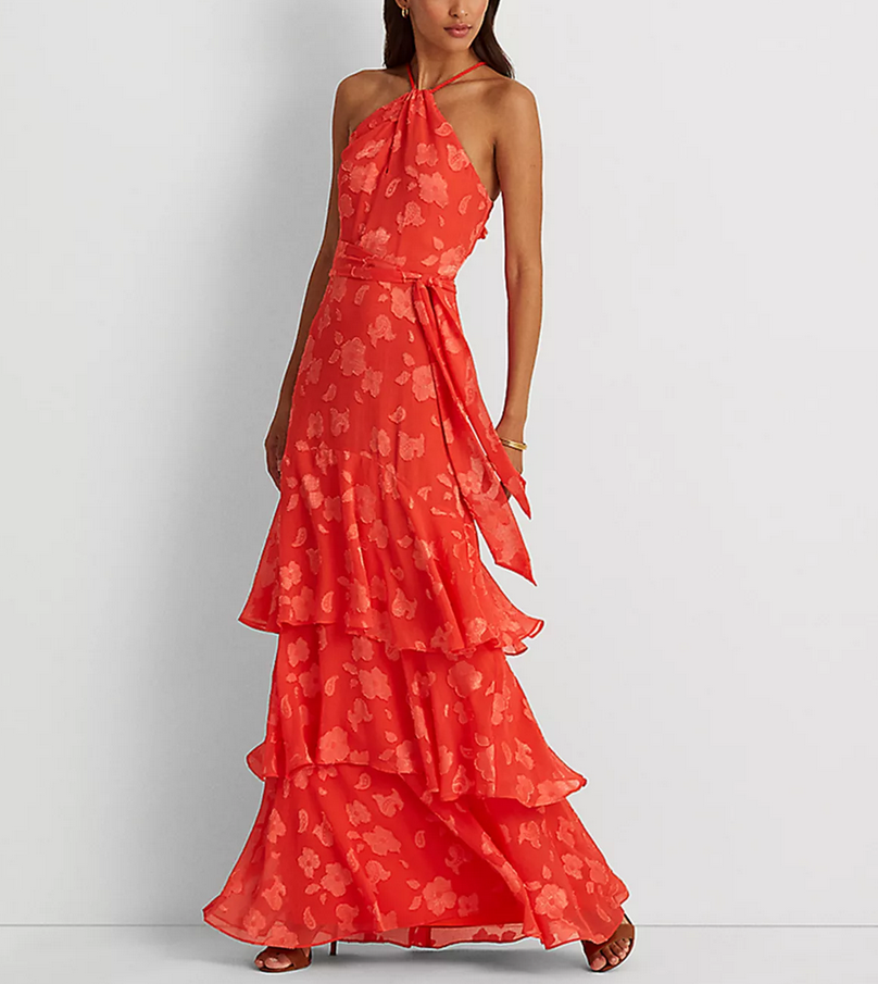 Cut for a flattering body-hugging fit, Lauren Ralph Lauren's airy georgette halter gown is characterized by its heritage-inspired floral jacquard design. Showcasing a breezy tiered skirt and a high-neck silhouette for added elegance, it includes a self-tie sash that accentuates the waist and offers an effortless finish.