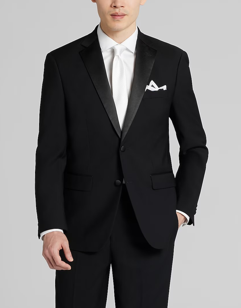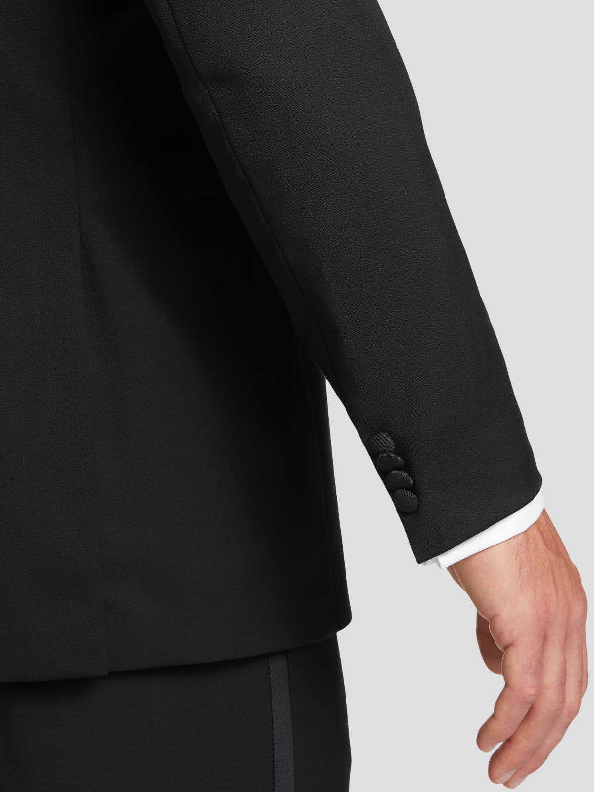 Center vent; fully lined; black satin lapel and trim at flap pockets