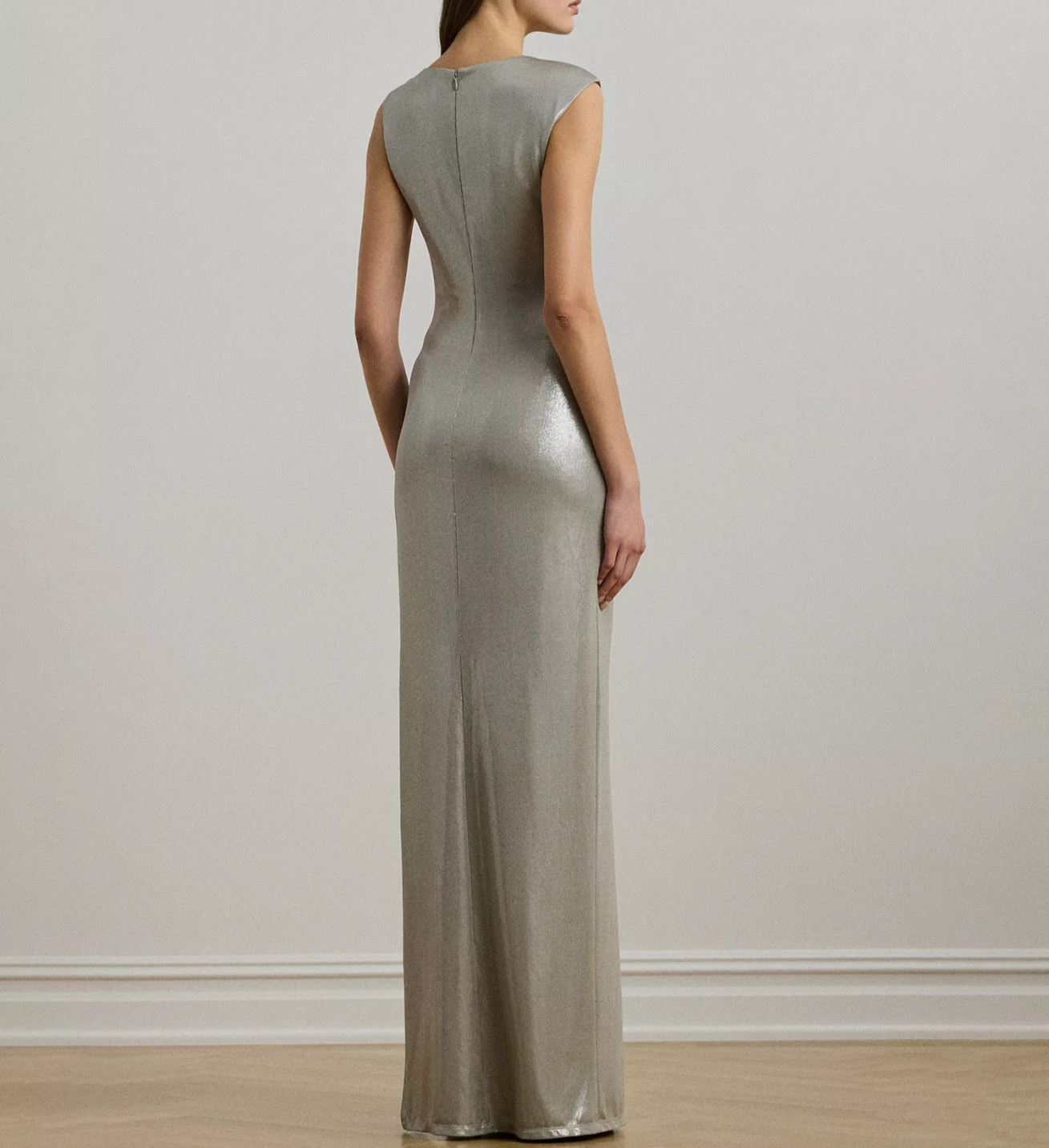 Cut with eye-catching metallic jersey for a fluid drape, this floor-length gown from Lauren Ralph Lauren features a statuesque column silhouette and a horseshoe-shaped, "LRL"-engraved buckle at the shoulder.