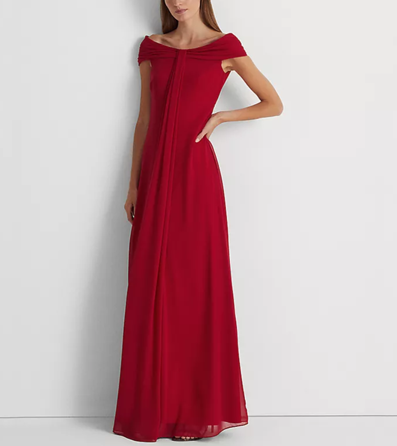 Airy chiffon lends effortless movement and a fluid drape to Lauren Ralph Lauren's floor-sweeping gown, which is distinguished by a graceful off-the-shoulder silhouette.