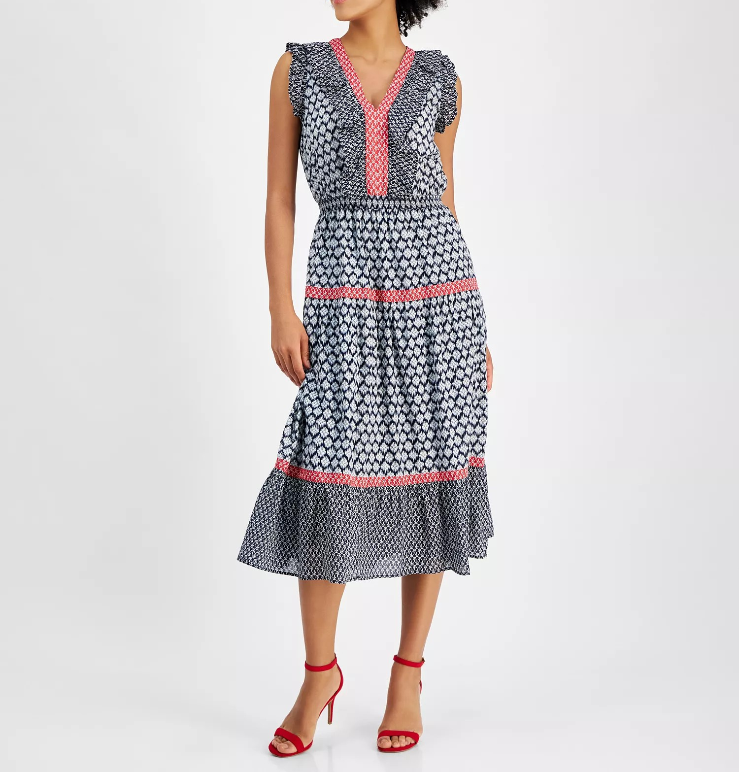 Nautica Jeans Women's Mixed-Print Tiered Midi Dress MSRP $119