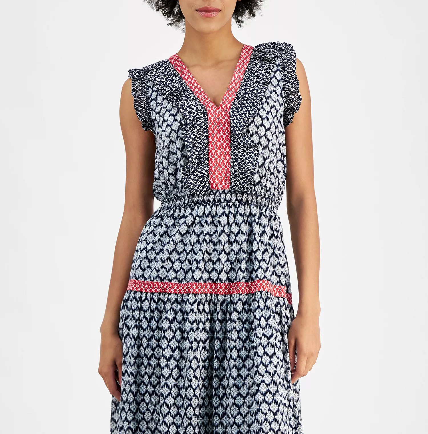 A mix of cotton prints delivers an eclectic air to this midi dress from Nautica Jeans featuring ruffles and tiers for flowy flair.