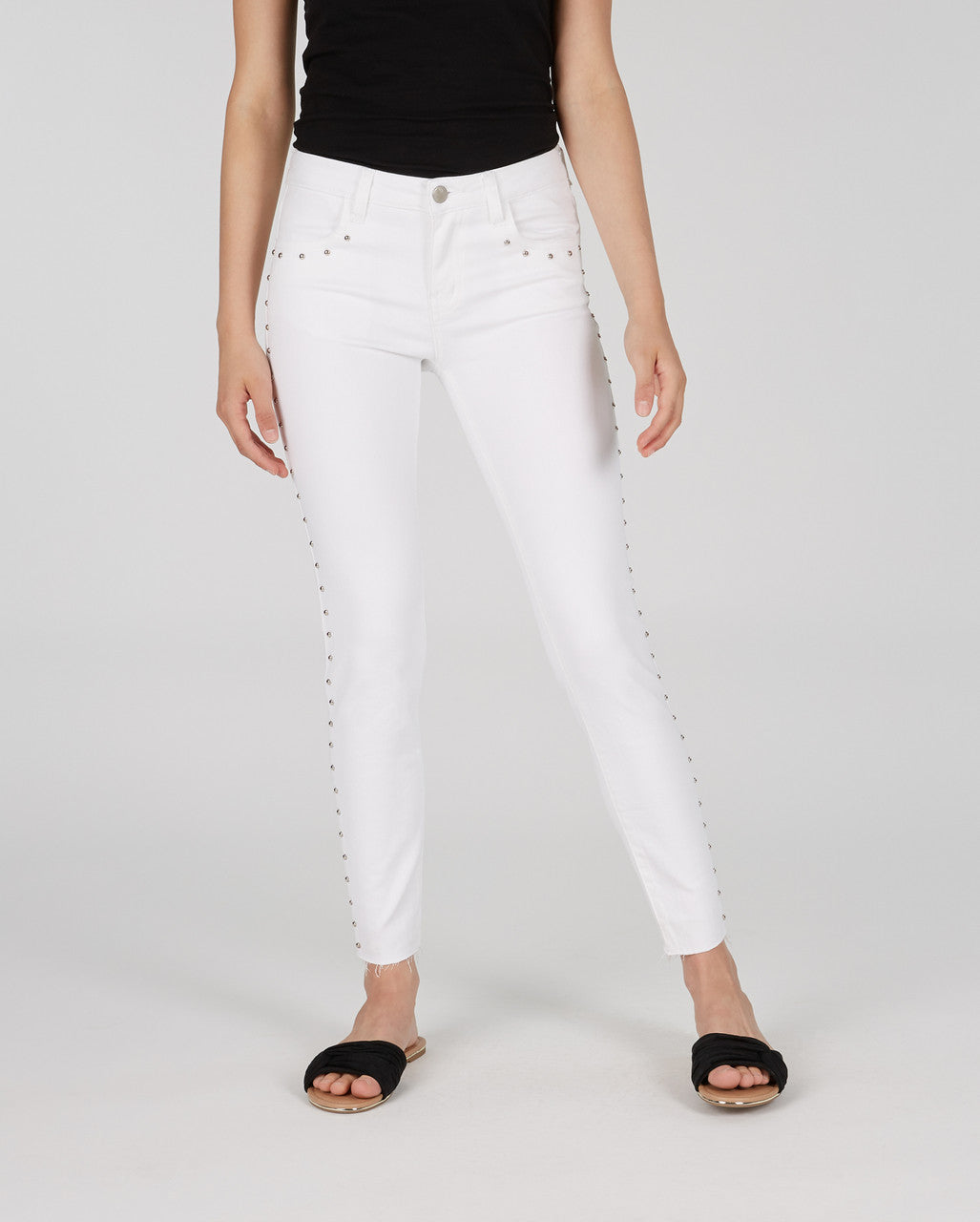 Numero takes skinnies up a notch with studded details all along the side seams. An ankle-length crop and frayed hems complete the look.