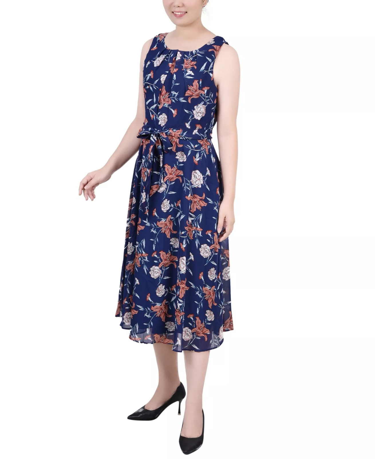 NY Collection Petite Sleeveless Chiffon Belted Dress MSRP $54