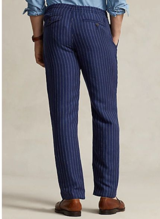 29" inseam Classic fit: sits at the waist; eased through the leg Elastic waistband with an interior drawstring Zip fly with a buttoned closure Two front angled pockets; two back buttoned pockets Signature embroidered Pony above the back right pocket Linen/lyocell/cotton Machine washable Imported