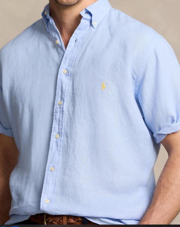 Button-down point collar Buttoned placket Short sleeves Split back yoke with a box pleat ensures a comfortable fit and a greater range of motion Signature embroidered Pony at the left chest 100% linen Machine wash Imported