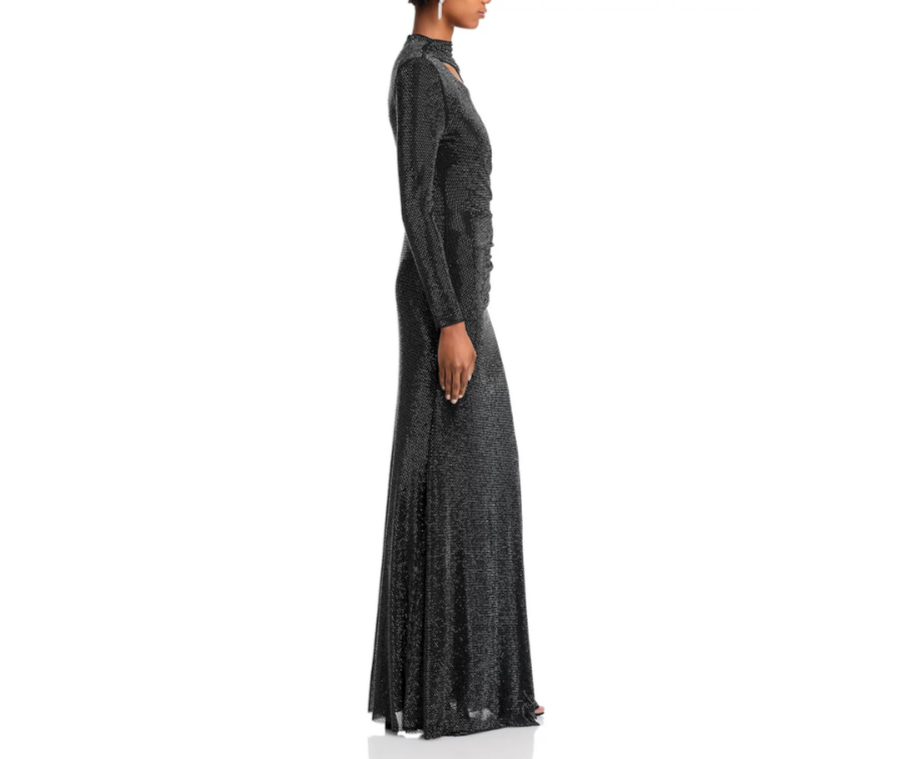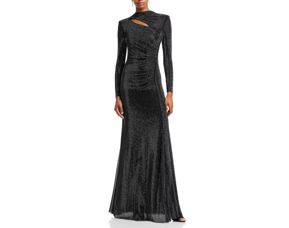 Cut from rhinestone-studded mesh, this floor-sweeping dress pairs its high-shine feel with a sleek silhouette, and an edgy cut-out to match. Show off its elegant neckline with statement earrings.
