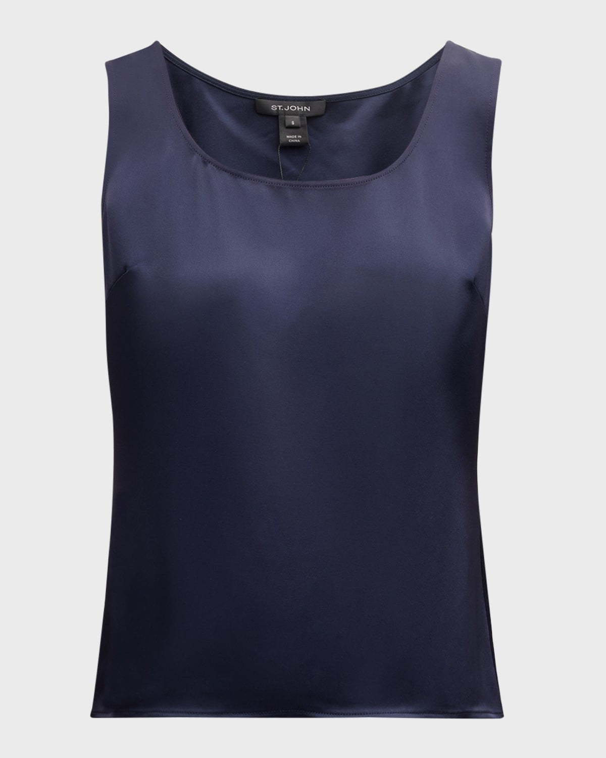 A timeless St. John staple rendered in a smooth figure-contouring liquid satin, this elegant shell looks polished paired with liquid satin pants.