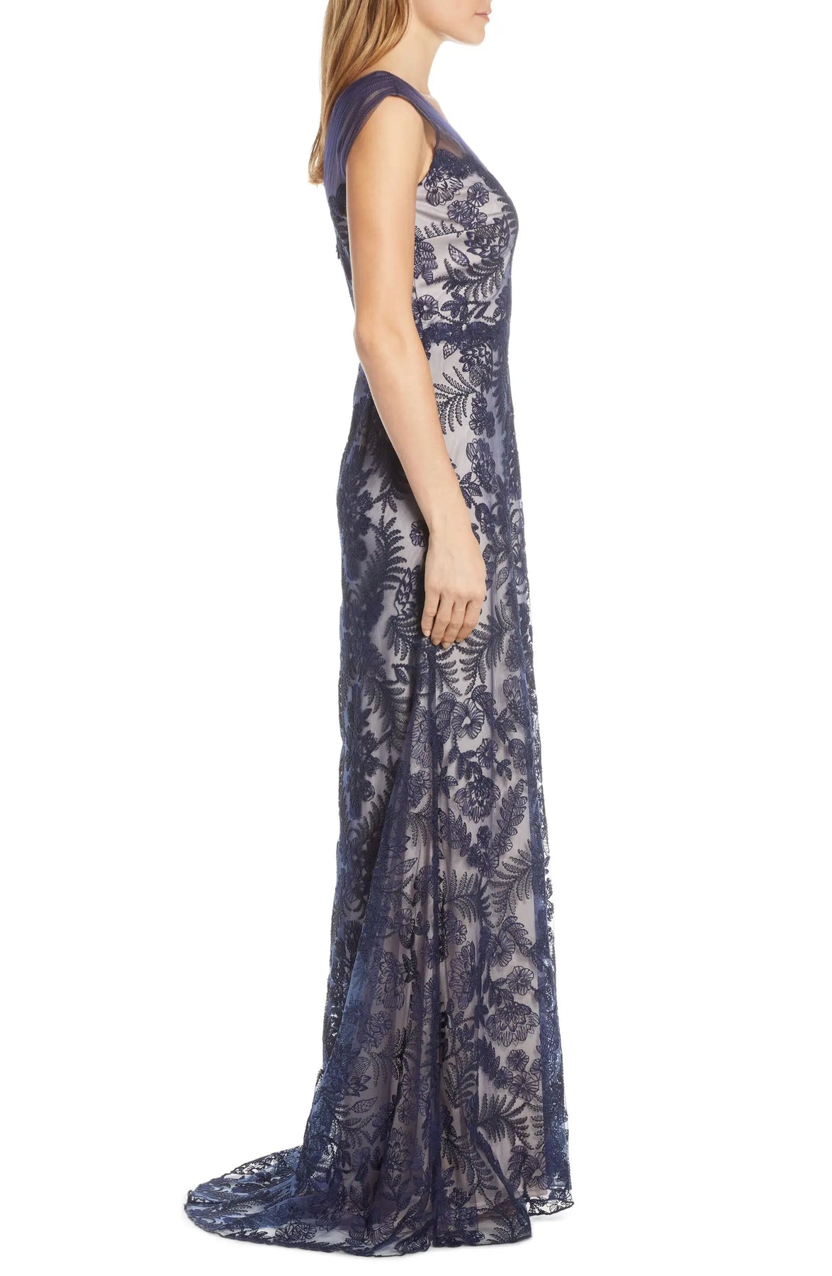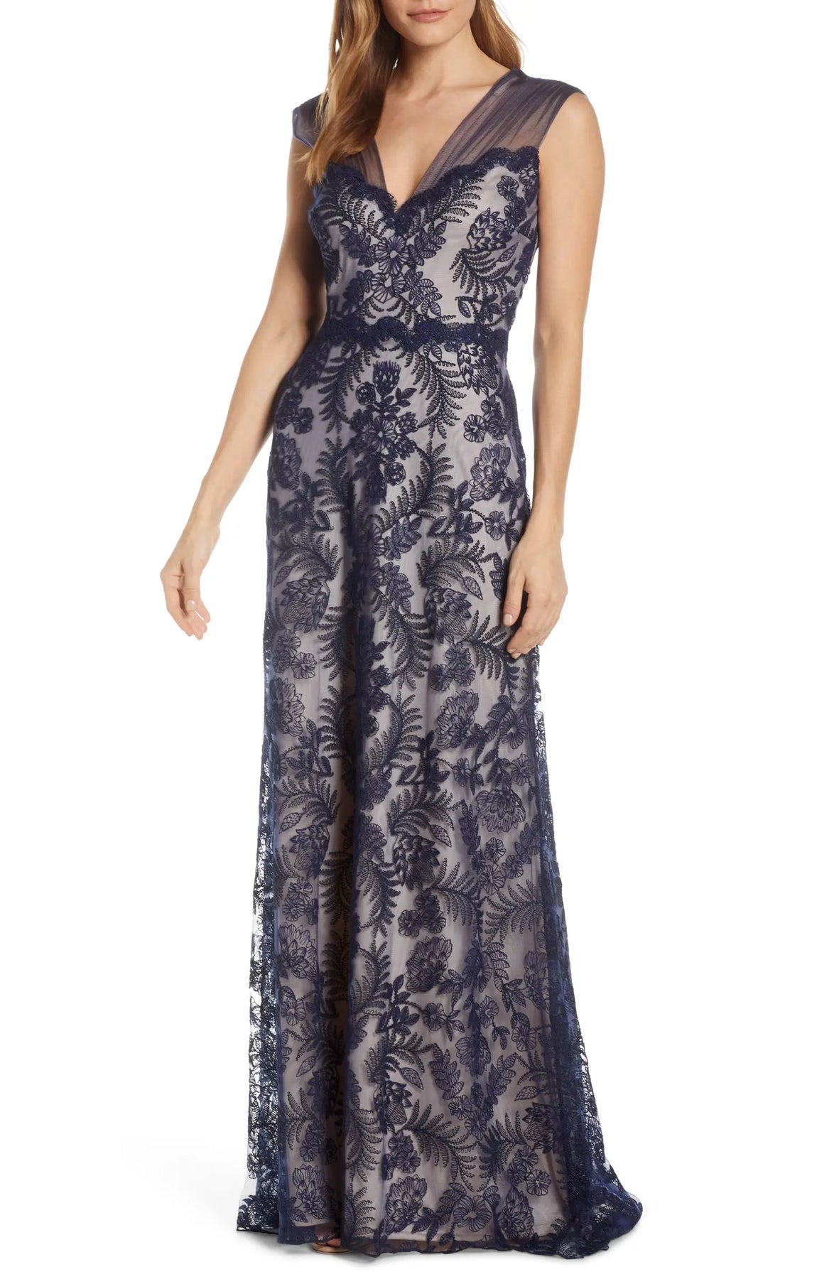 Body-skimming fit through bust, waist and hips Slightly-stretchy fabric Designed for a floor-length look V-neck and back Semi-sheer shirred shoulders Sleeveless, strapless-bra-friendly Scalloped styling at bust and waist Draped A-line skirt silhouette Allover embroidered mesh lace Concealed back zip with hook-and-eye closure Partial contrast lining Polyester/nylon; contrast: Nylon; lining: Polyester Dry clean Imported