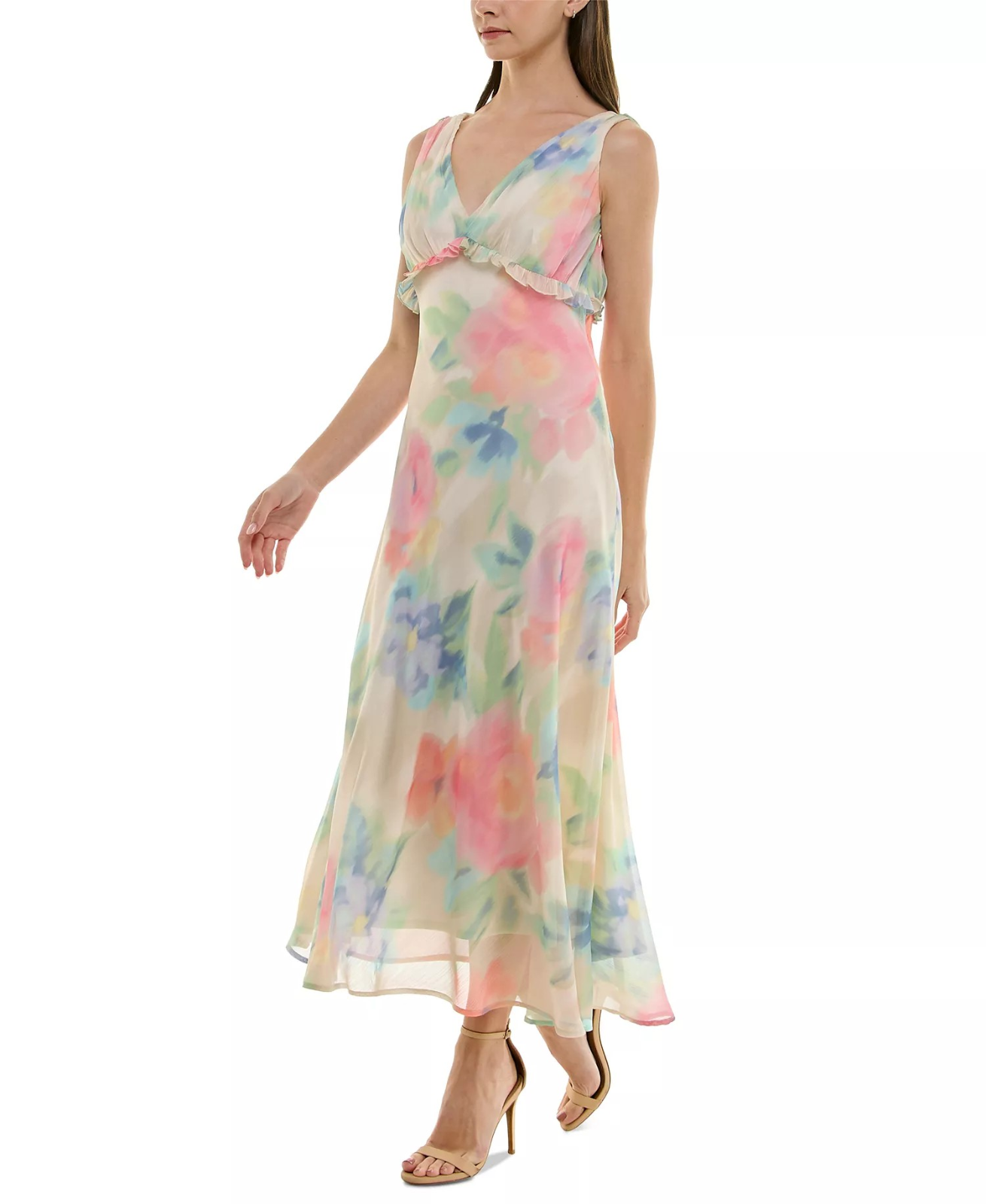 We love the wash of floral colors on airy chiffon that defines this flawlessly flowing dress from Taylor.