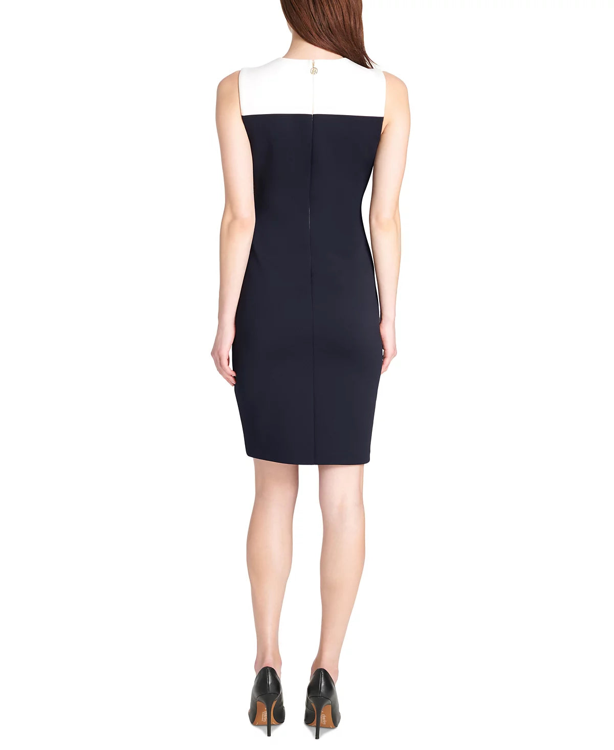Gleaming rivets accent the chic asymmetrical hem on this sleeveless sheath dress from Tommy Hilfiger, perfectly colorblocked for modern charm.