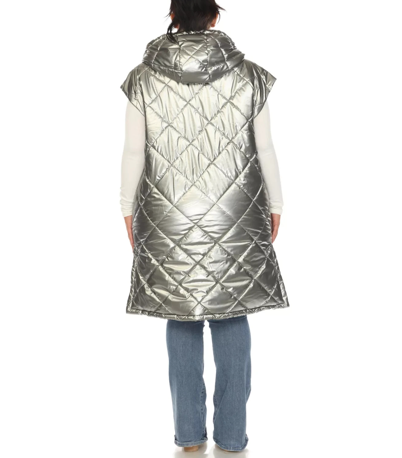 Elevate your winter wardrobe with this stylish hooded long puffer vest. Featuring a metallic diamond quilted design, it offers warmth and a flattering silhouette. The two-way zipper allows versatile styling, while the cozy hood and side pockets add functionality. A winter must-have.