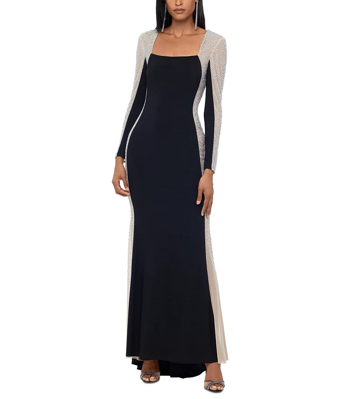 A colorblocked design lends a high-style look to this beautifully embellished gown from XSCAPE.