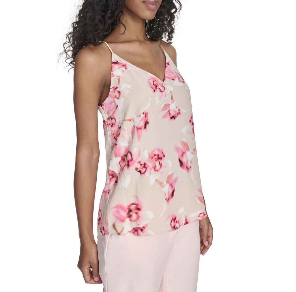 Calvin Klein's beautifully printed V-neck top features a sleeveless silhouette that allows for easy layering, making it a versatile piece for your wardrobe.