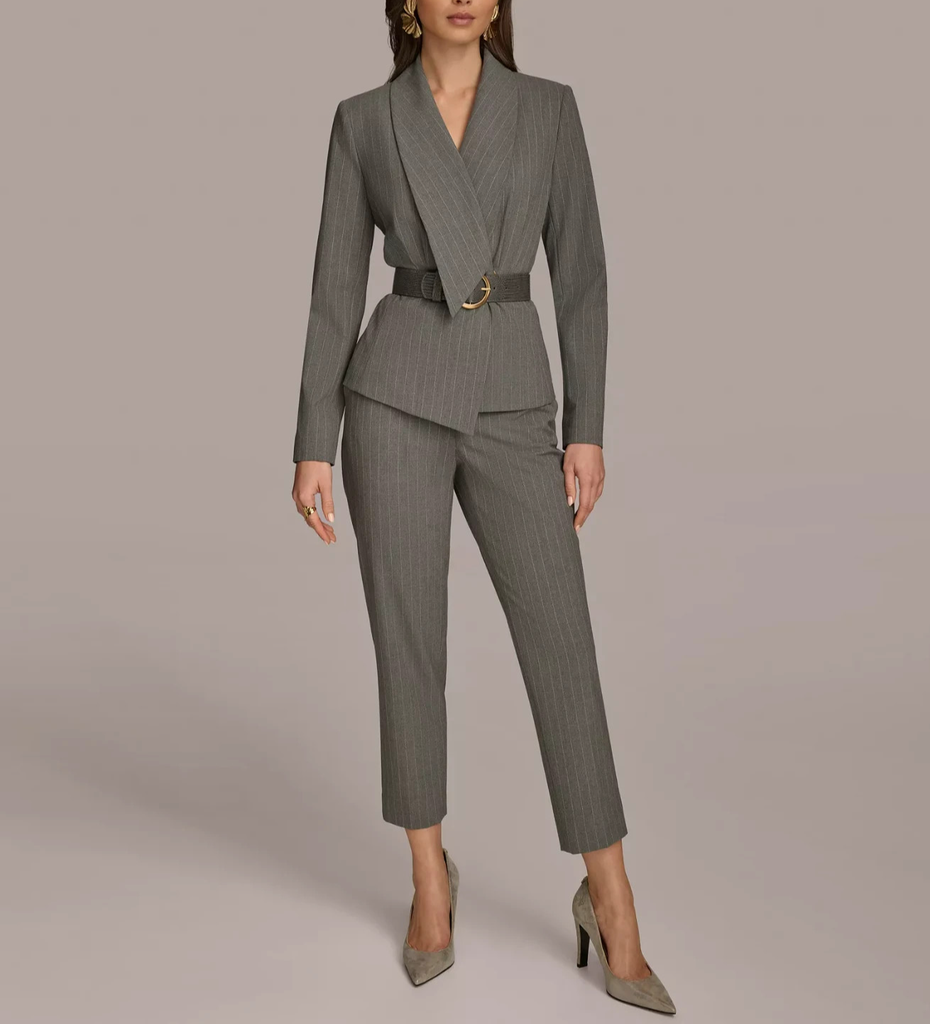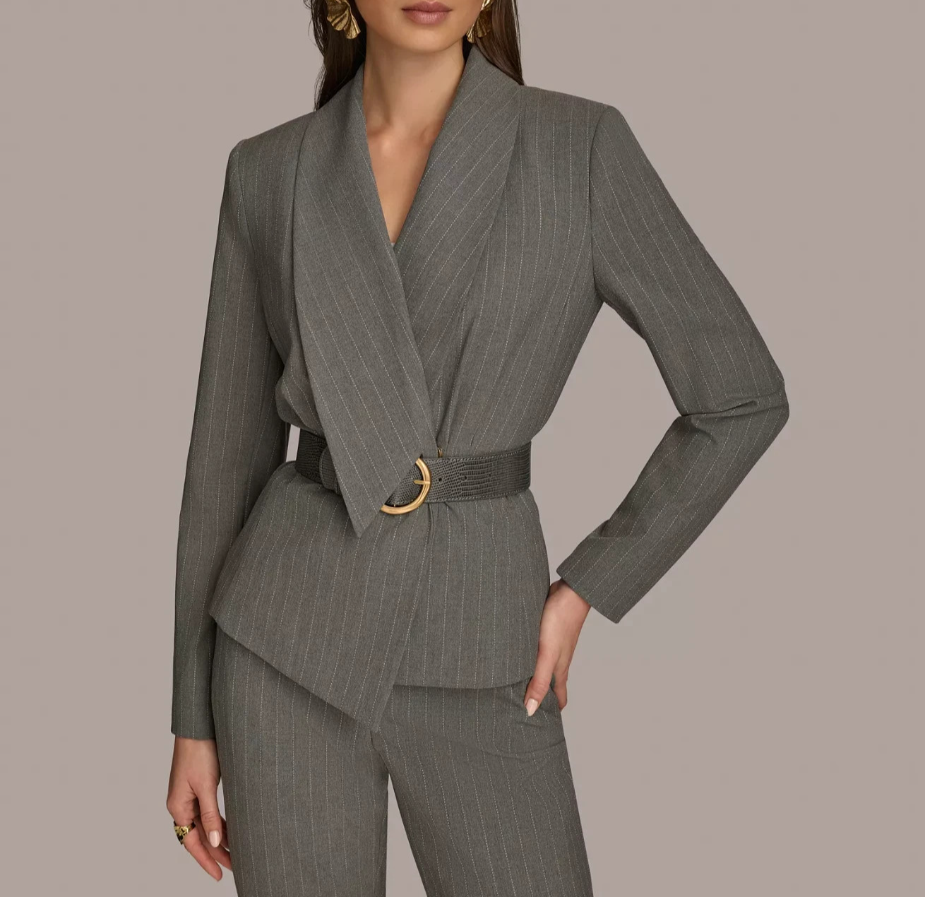 Update your wardrobe for the season with this chic belted pinstripe blazer from Donna Karan New York.