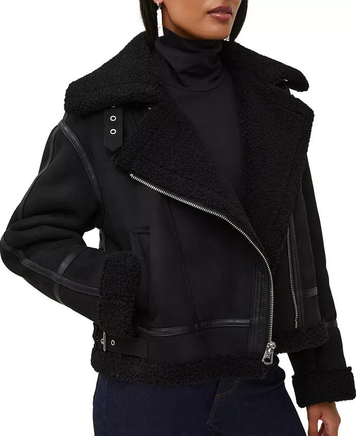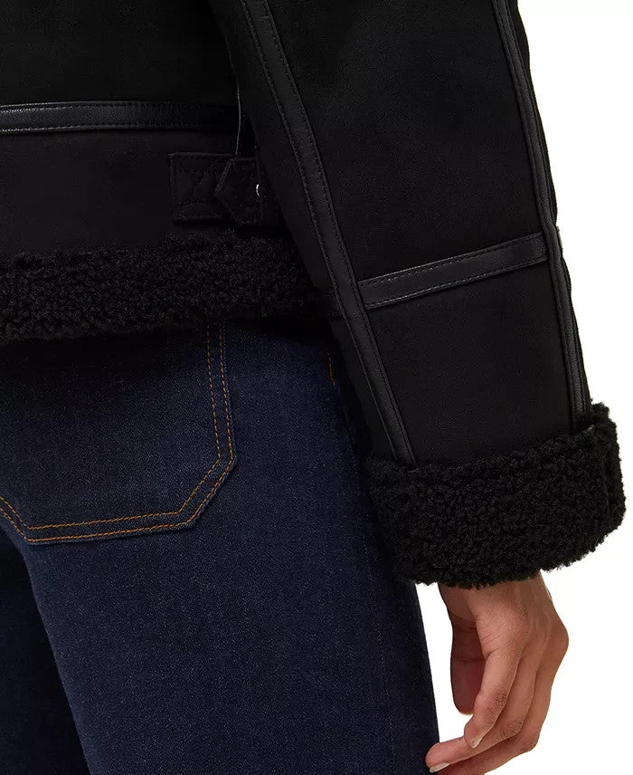 Keep it cozy in this zip-front jacket from French Connection. The sleek faux leather trim paired with plush faux shearling collar, cuffs and lining make it perfect for chilly days.