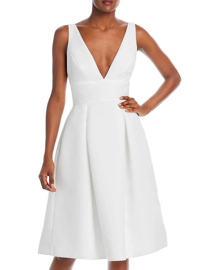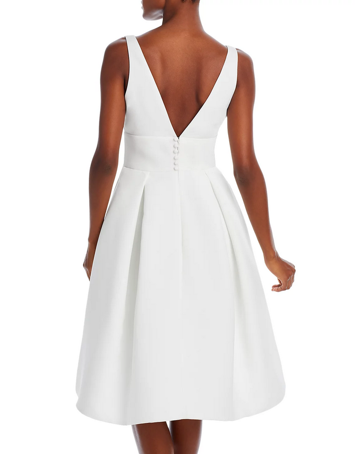 Double V-neckSleevelessWide banded waistFull A-line skirt with front and back pleatsSide slit pocketsBack zip closure with buttons100% polyesterDry cleanImported
