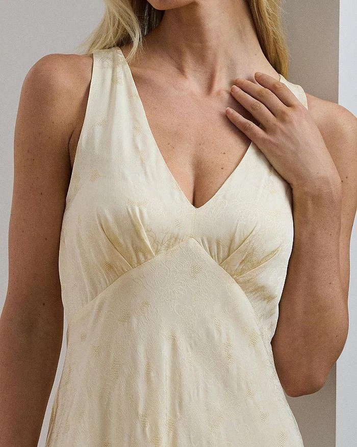 Recalling glamorous vintage styles with its V-neck and empire waist, this sleeveless dress from Lauren Ralph Lauren features a fluid A-line silhouette realized in tonal floral jacquard fabric for subtle dimension.