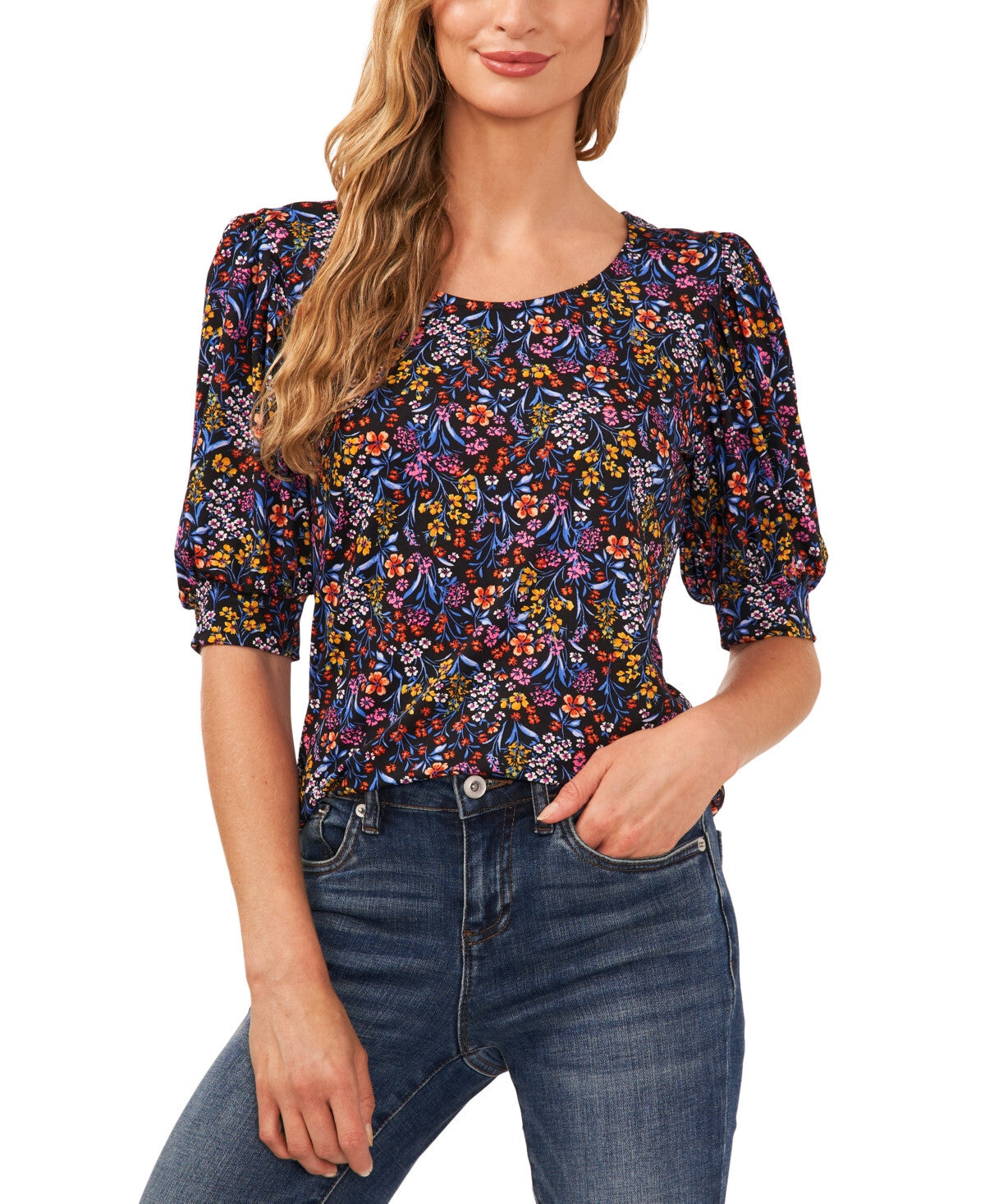 A floral print and puffed sleeves lend a whimsical touch to CeCe's scoopneck knit top.