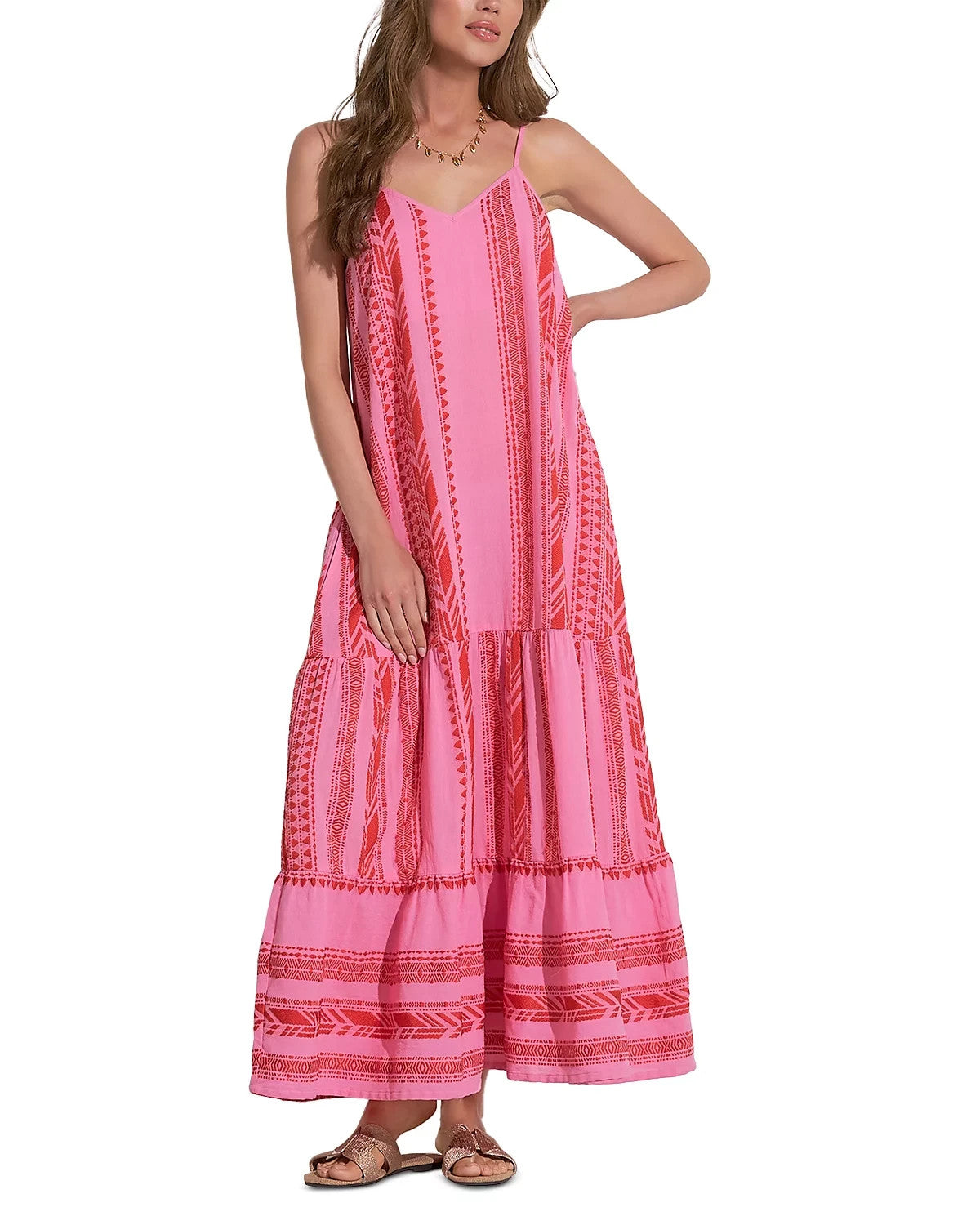 V-neck Pullover style Sleeveless with adjustable straps Side-seam pockets at hips Tiered design Allover embroidered Loose fit at the bust, waist and hips Non-stretch fabric Designed for a floor-length look Cotton/polyester; lining: Cotton Hand wash Imported