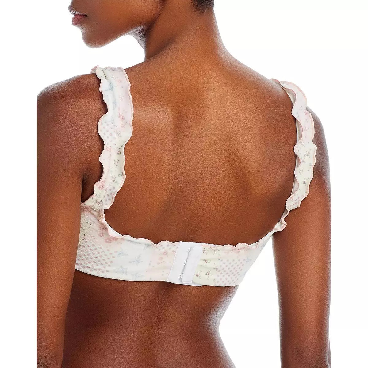 Straight neckline with front button detailFixed shoulder straps with ruffled trimBack hook closurePolyester/spandexHand washImported