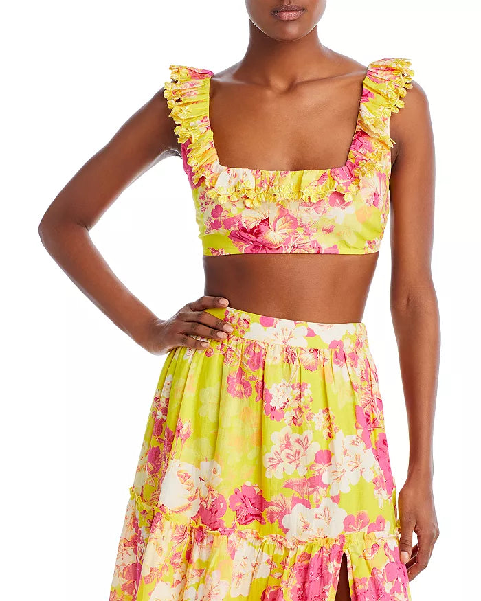 Square neckEmbroidered ruffle overlay at necklineSleevelessCropped silhouetteAllover floral printScoop backBack button closuresCotton/linen; lining: CottonDry cleanImported